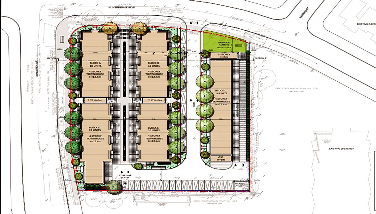At the intersection of Pharmacy and Huntingdale will be two blocks of 18 townhomes (Blocks A and B), while Block C will have 14 standard townhome units.